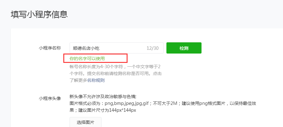 2. 当你填写的小程序名称检测后提示如图信息“你的名字可以使用”,说明你的名称还没有被注册,你可以注册使用。