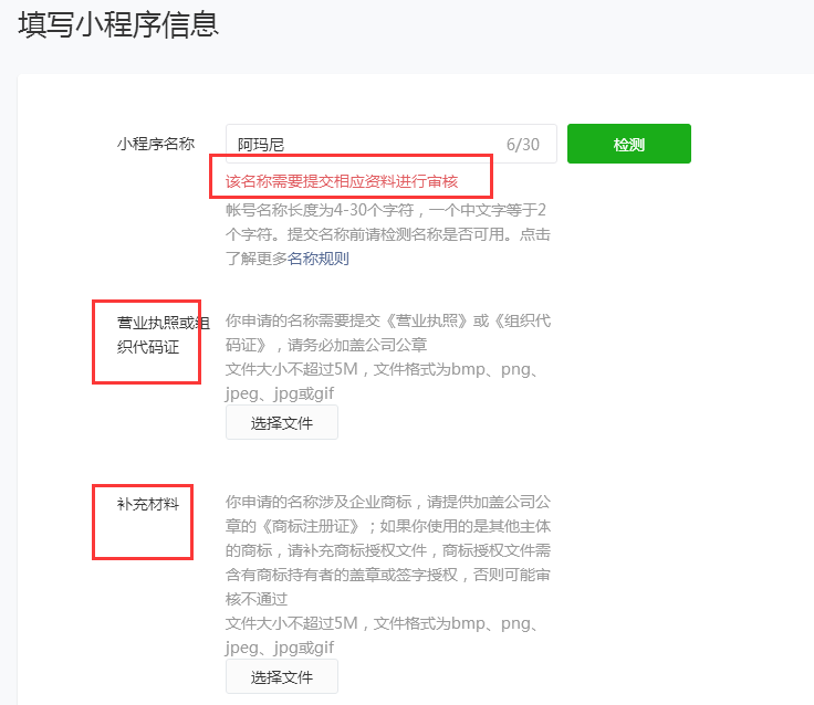 4. 当你填写的小程序名称检测后提示如图信息,说明你的名称属于品牌名或商标,需要提供营业执照和其他证明材料,微信审核通过后,这个名称才能是你注册。