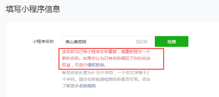 3. 当你填写的小程序名称检测后提示如图信息,说明你的名称已被注册小程序或被注册了公众号,若这个名称是你的商标,那么你可以点击“侵权投诉”否则你不能注册。