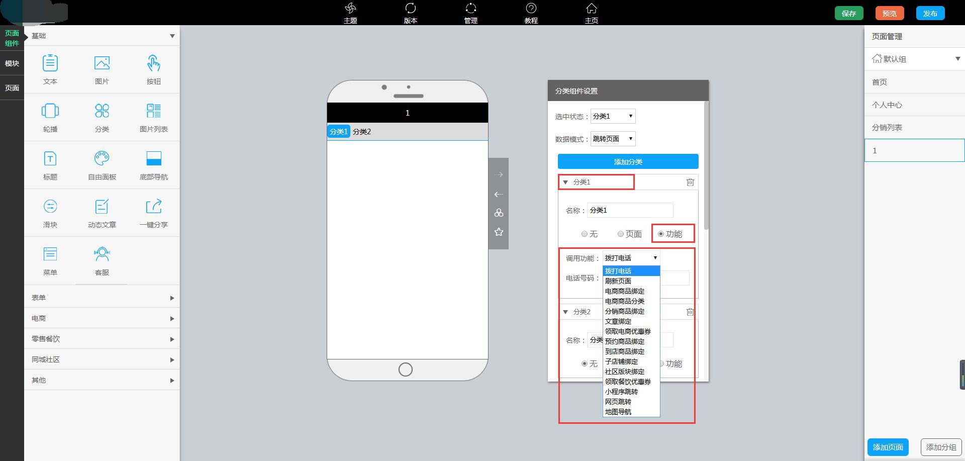 3.可以选择“页面”-“链接至”选择页面。也可以选择“调用功能”,“调用功能”中可以选择“拨打电话”、“刷新页面”(新功能持续上线)。