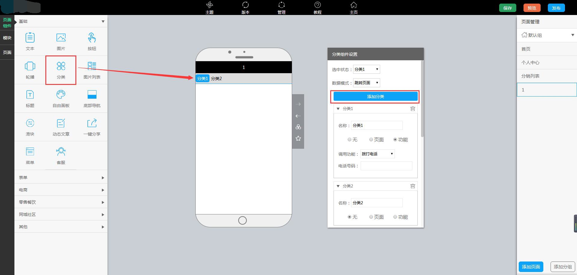 1.每一项可以更改分类名称、设置点击事件,可增加和减少分类。每个分类都可以进行单独设置。