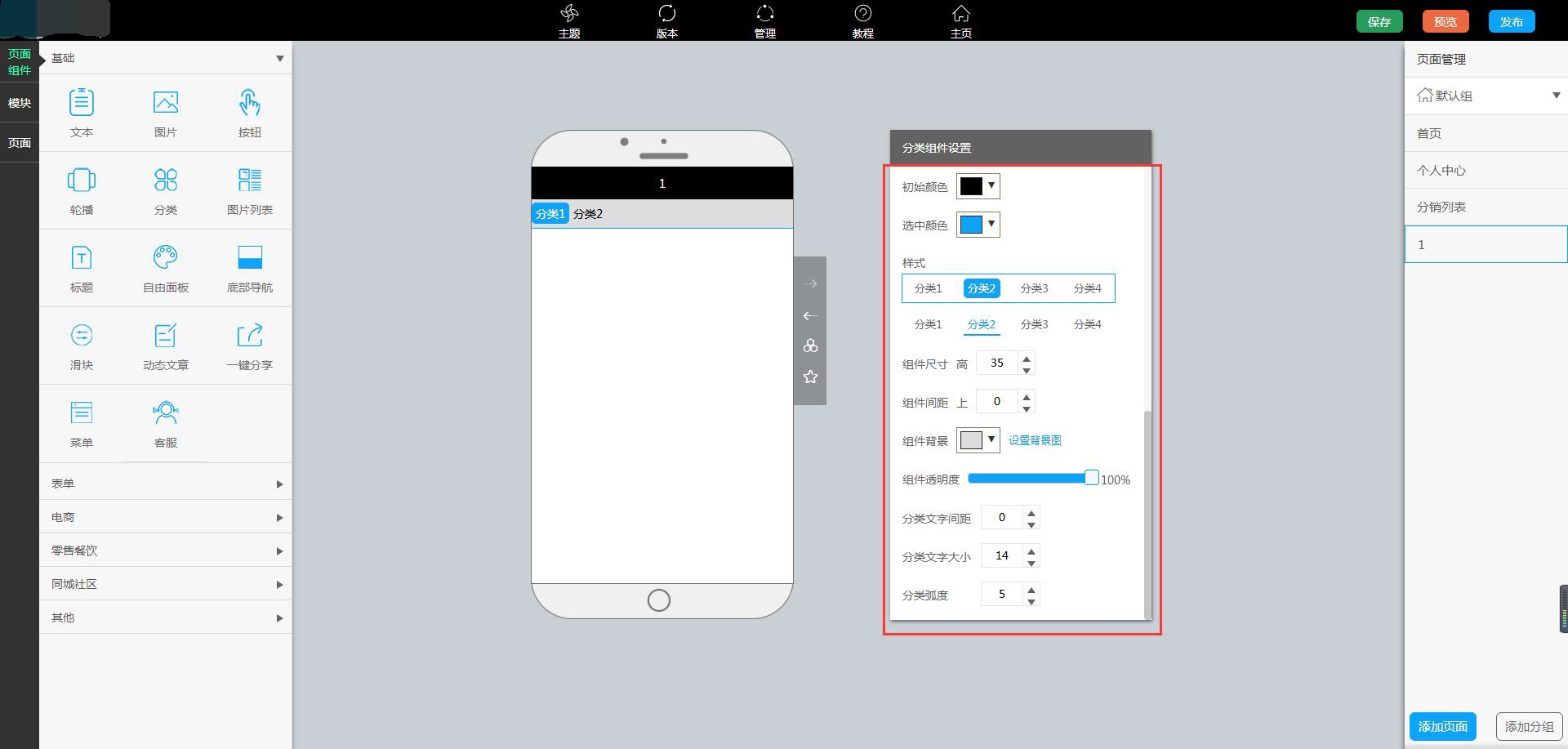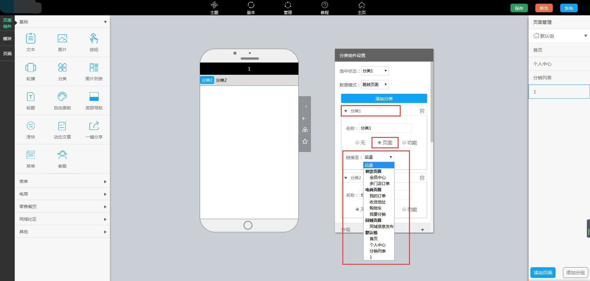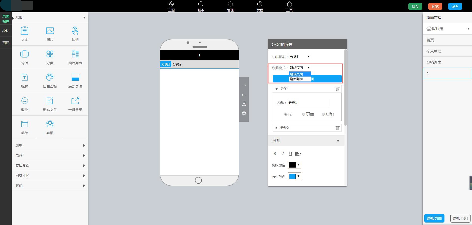 2.数据模式可选择“跳转页面”和“刷新列表”。跳转页面则跳转到需要的页面,刷新列表即不跳转页面,在本页面刷新。注意:只有添加了商品、秒杀、拼团、分销、店铺、话题列表和产品展示组件才能绑定列表,并且列表组件必须和分类组件在同一个页面上。
