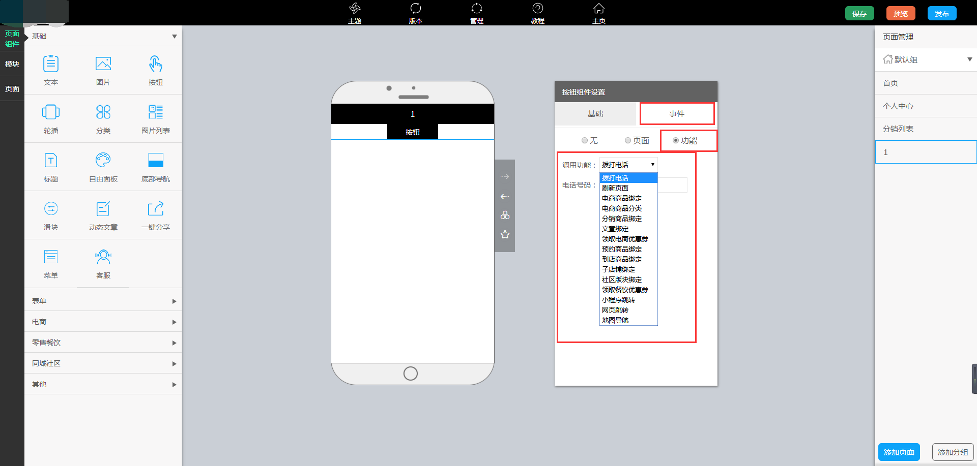 2.“点击事件”的“功能”选项,可以选择“调用功能”。“调用功能”中可以选择“拨打电话”、“刷新页面”。