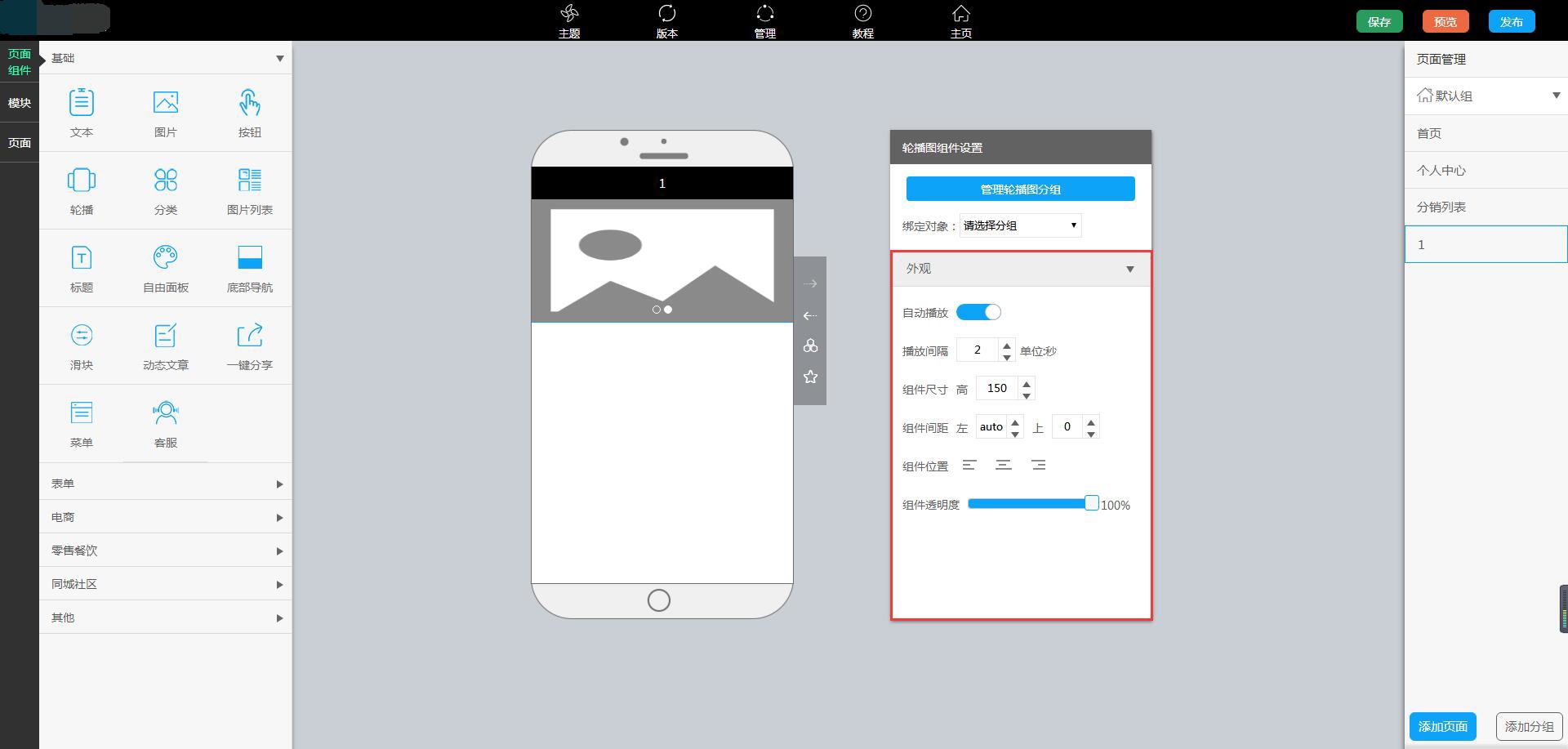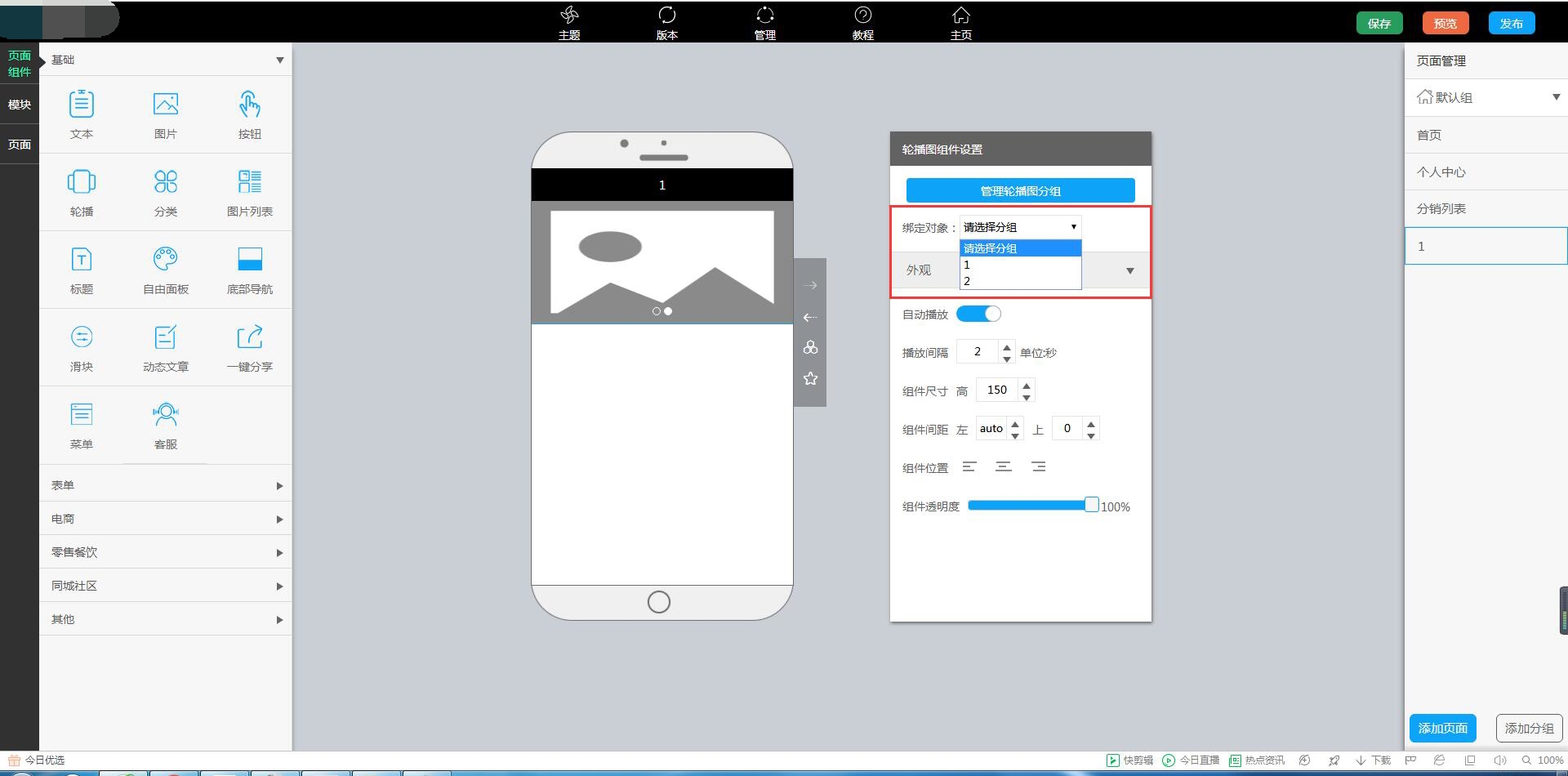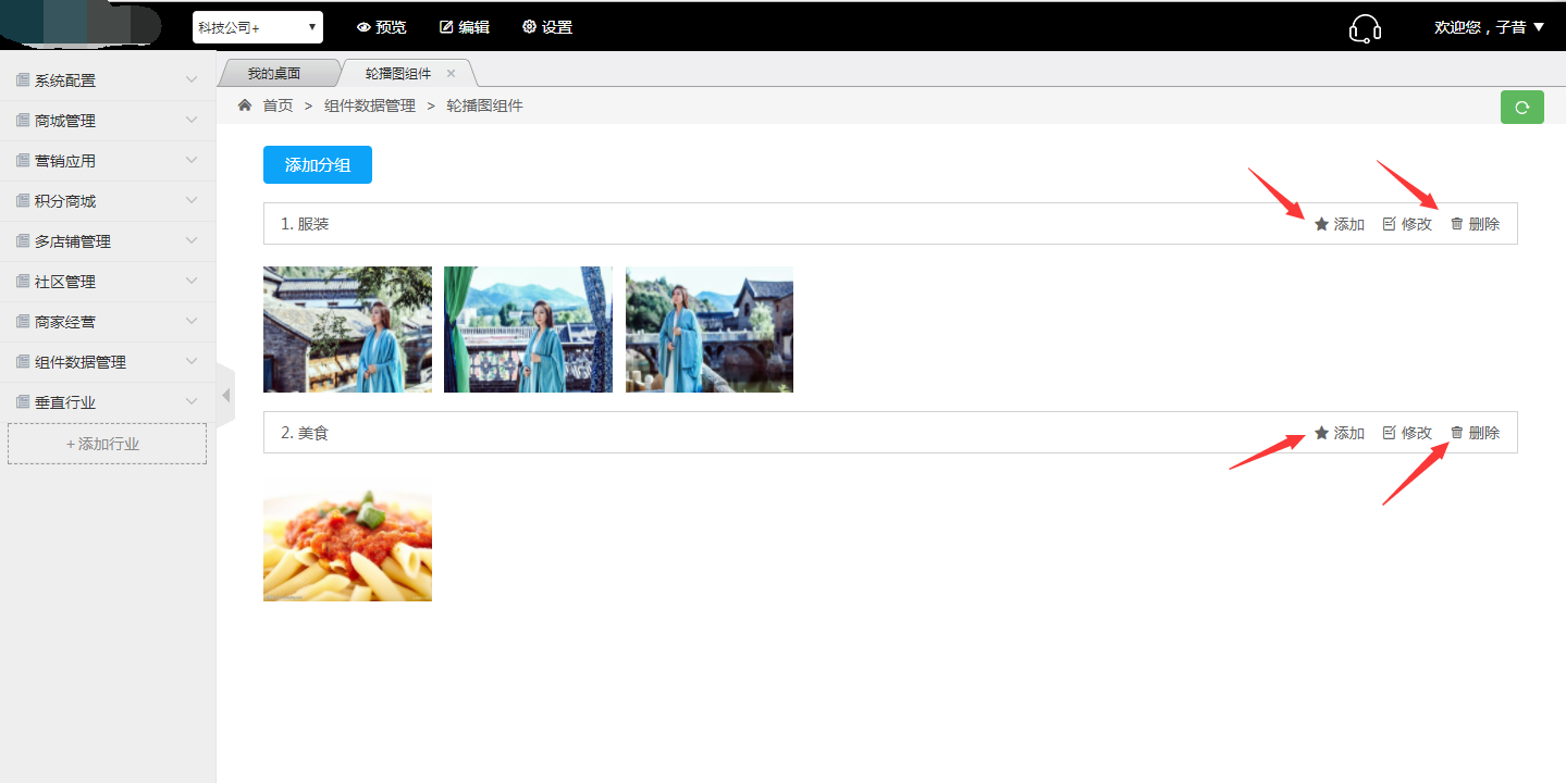 1.点击编辑页面右侧的管理轮播分组,进入管理后台进行分组以及图片添加