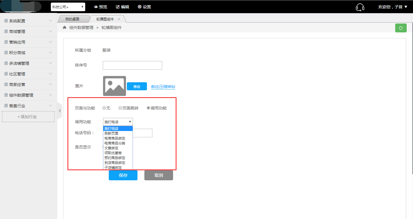 3.添加图片的时候,可对改图片进行页面跳转和调用功能设置,“页面跳转”可设置跳转到其它页面,“调用功能”可选择“拨打电话”、“刷新页面”、“电商商品绑定”等等;